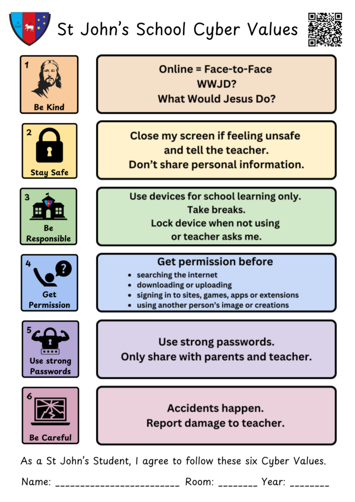 Cybersafety: At the beginning of each year, students in Years 3 to 6 agree to this Cyber Values Student Agreement.